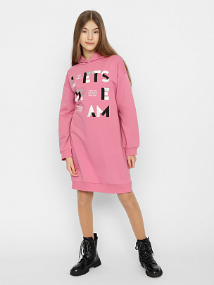Платье для девочки с длинными рукавами и капюшоном. Рукава с манжетами по низу. Нижние срезы платья обработаны притачным поясом. Пояс и манжеты выполнены из полотна с эластаном. Перед платья декорирован принтом "Давай мечтать".