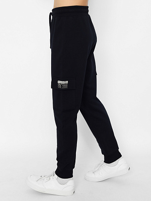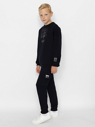 Брюки для мальчика с накладными карманами с клапаном. Нижние срезы брюк оформлены притачными манжетами из полотна с эластаном. Пояс притачной, с резинкой и функциональным шнуром. На карман настрочена декоративная жаккардовая этикетка.
