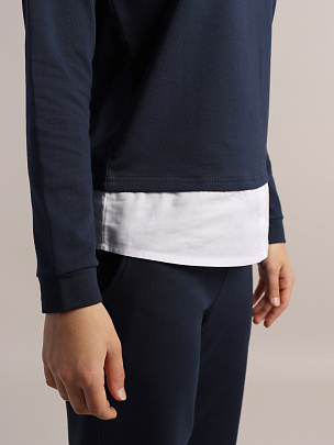 Джемпер с длинными рукавами из футера. Горловина круглая, обработана отложным воротником из сорочечной ткани. На спинке обработана застежка "капелька" на пуговичку. Рукава с манжетами по низу. Нижние срезы переда и спинки обработаны притачными деталями из сорочечной ткани, создающими ощущение двухслойного изделия.